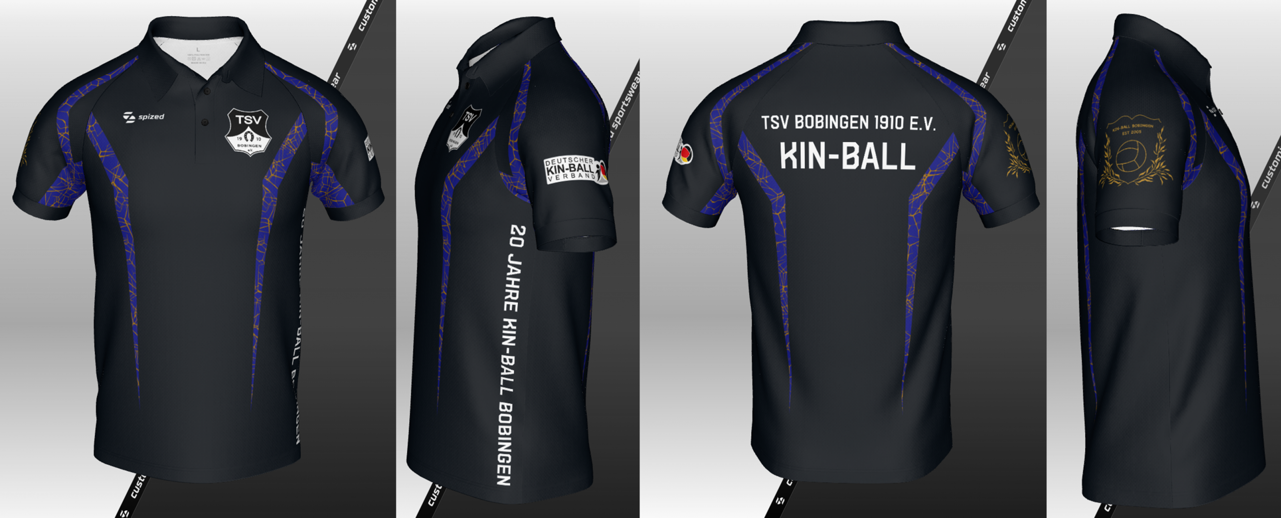 Das passende Poloshirt zum Trikot. Das Shirt ist bedruckt (aber nicht personalisiert). Auf der Brust ist das TSV-Logo abgedruckt, an den Seiten das 20-Jahres-Emblem, sowie das Verbandslogo. Auf der Rückseite ist oben TSV Bobingen 1910 e.V. Kin-Ball zu lesen.