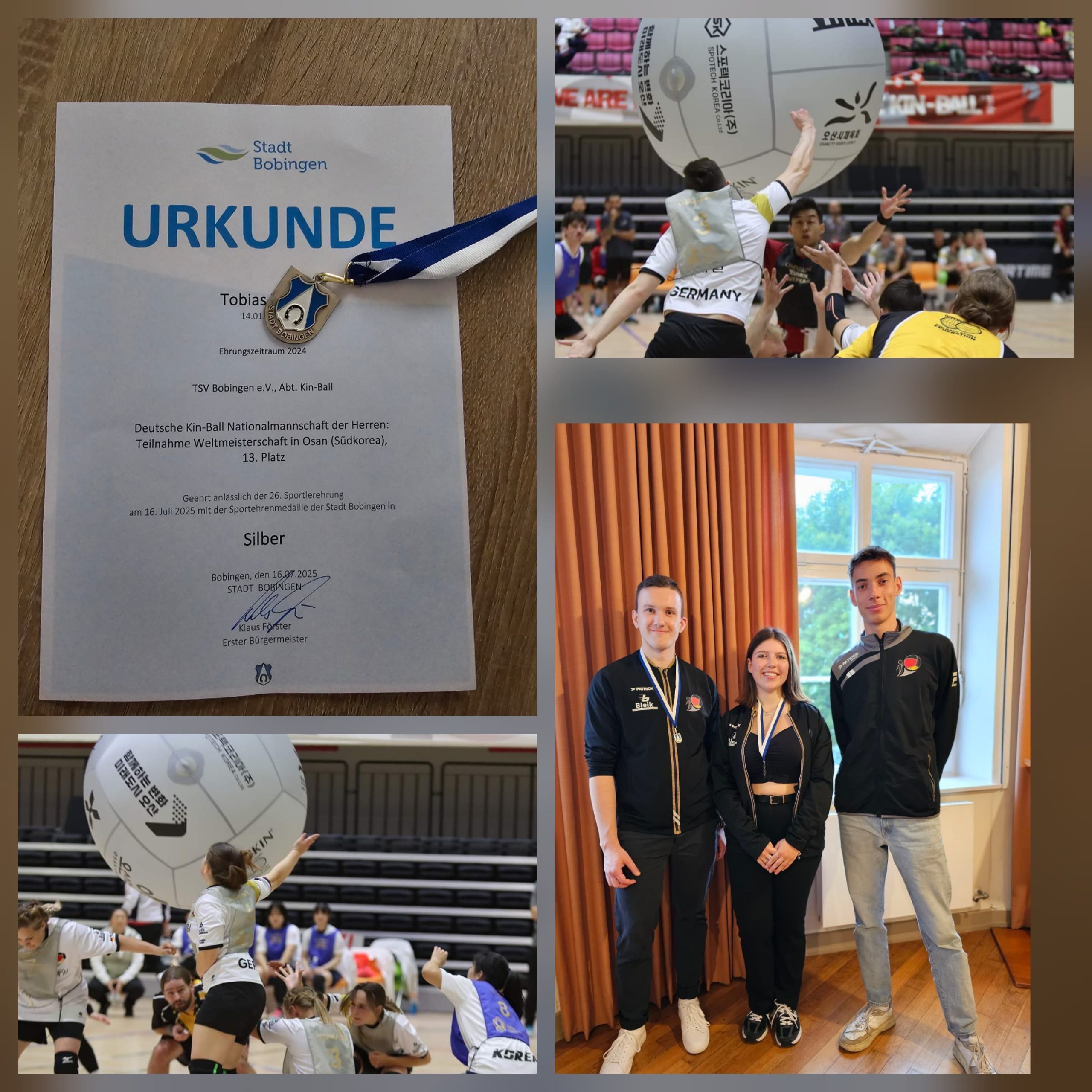 Auch dieses Jahr wurden unsere Nationalspieler/innen wieder zur jährlichen Sportlerehrung der Stadt Bobingen eingeladen. Dort durften die drei Spieler/innen die Silbermedaille für ihre Teilnahme an der Kin-Ball WM 2024 vom Bürgermeister entgegennehmen.